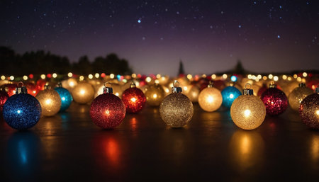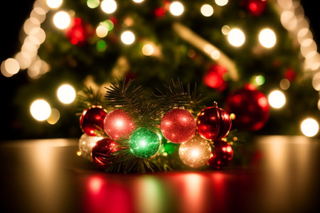 A cozy Christmas scene featuring red and silver ornaments illuminated by soft, golden bokeh lights, creating a warm and festive atmosphere.