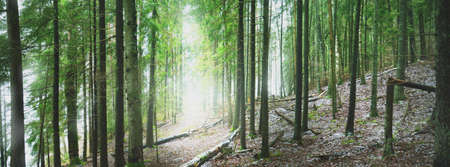 Beautiful natural scenic backdrop with green pine trees. Pine forest background