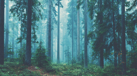 An atmospheric landscape features tall evergreen trees shrouded in thick fog. The scene is dominated by shades of green and gray, with soft lighting and a blurred background. Suitable for a variety of uses including environmental, travel, and natural beauty themes.