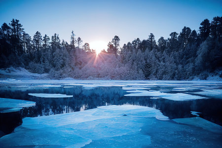 Sun glowing over frozen forest lake with spruce tree covered hoarfrost winter background