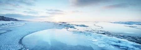 Frozen lake with ice floes at sunset. Beautiful winter landscape