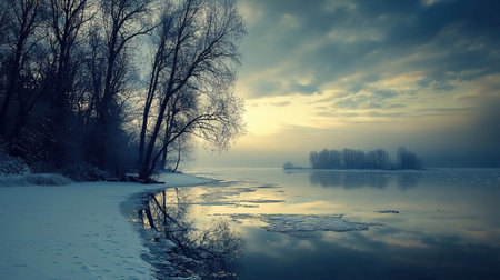 A tranquil winter landscape featuring a frosty river surrounded by bare trees and soft fog. This icy scene evokes feelings of peace and stillness in nature.