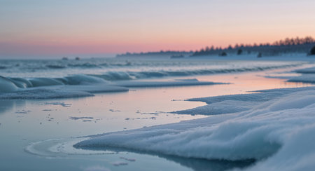 AI Generated. Serene Ocean View with Icy Shores and Calm Waters at Dusk