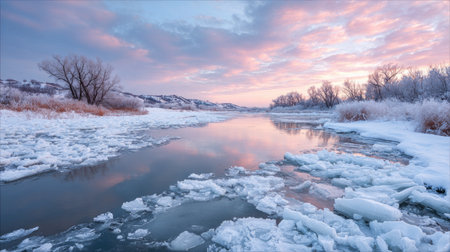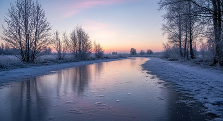 A tranquil winter scene unfolds as a frozen river meanders through a landscape dusted with frost. Bare trees with intricate branches line the banks, their forms softened by the icy coating. The sky above a delicate gradient of pastel colors, transitioning from soft pinks to pale blues as dawn breaks. The smooth ice reflects the subtle hues of the sky, creating a mirror-like surface that enhances the peaceful and serene atmosphere of this cold, morning.