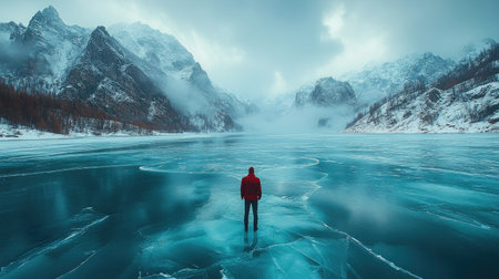 A serene winter landscape with a person standing on the edge of a frozen lake preparing to take a frigid plunge for a burst of vitality