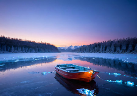 Christmas Lights On A Small Boat In A Frozen Lake, At Dusk. Generative AI
