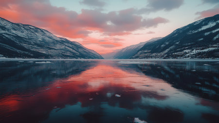 Majestic Winter Landscape with Frozen Lake Reflecting a Dramatic Sunset Over Snowy Mountains