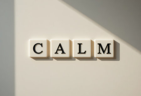 An artistic representation of the word calm using letter tiles, symbolizing tranquility and peace. The soft background and shadows create a soothing atmosphere perfect for wellness themes.