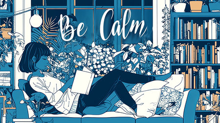 A woman relaxing among green plants and books, embracing serenity and tranquility.
