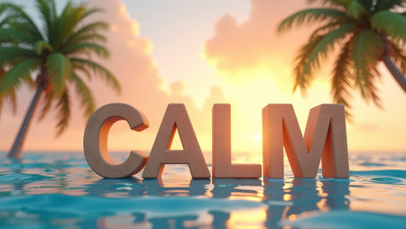 Serene Calm word in sandy tones by rippling water digital palm trees sunset beach scene