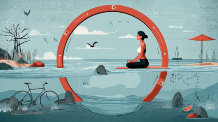 A tranquil illustration featuring a woman meditating peacefully by the water, framed by a circular design, embodying calmness and connection to nature.