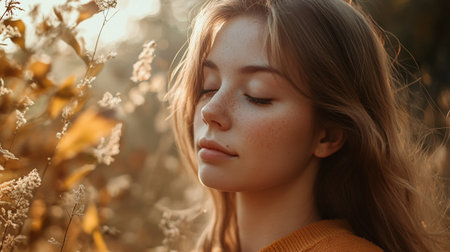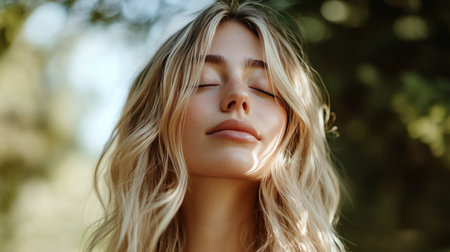 A serene woman with closed eyes, basking in sunlight, embodies tranquility and peace in a beautiful outdoor setting.