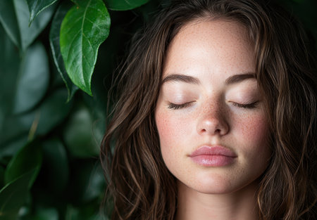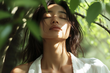 A tranquil woman closes her eyes, enveloped in the calm of dense green leaves, in a moment of peace