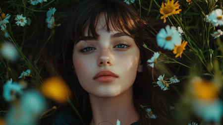 A stunning close-up portrait of a serene woman surrounded by flowers, showcasing beauty and tranquility. The soft colors evoke a sense of peace and natural charm.