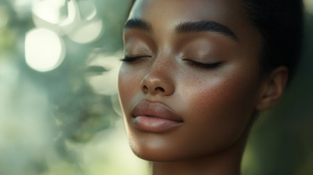 A serene womans face with flawless skin and a peaceful expression, her soft makeup highlighting her natural beauty, set against a blurred background.