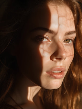 A womans serene expression is highlighted by soft light and shadow, creating a poetic interplay that evokes deep emotions and reflections of contrast.
