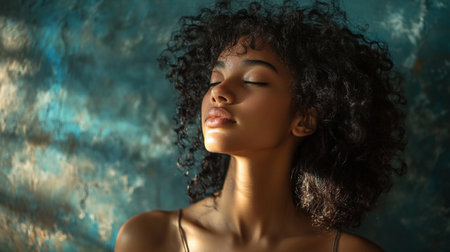 A beautiful woman with luscious curly hair gazes thoughtfully to the side, her eyes gently closed in a moment of tranquility. The soft lighting accentuates her radiant skin and the delicate features of her face, creating an intimate and peaceful atmosphere