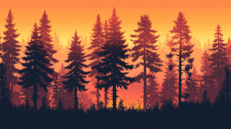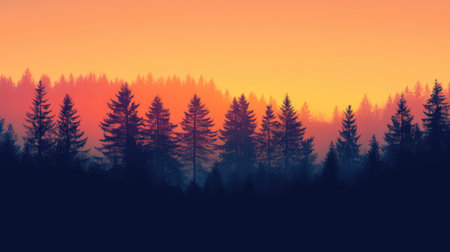 A stunning silhouette of evergreen trees against a vibrant sunset. The warm colors create a serene and tranquil atmosphere, perfect for nature lovers.