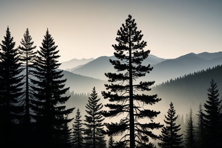 An image showcases a vast forest, dominated by towering evergreen trees shrouded in a soft, misty atmosphere. The composition emphasizes the density and height of the trees, with a play of light and shadow. The scene evokes a sense of natural beauty and could be suitable for various editorial and commercial projects.