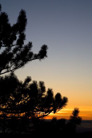 Silhouetted pine trees stand against a dark blue dusk sky illuminated by a warm orange glow on the horizon.