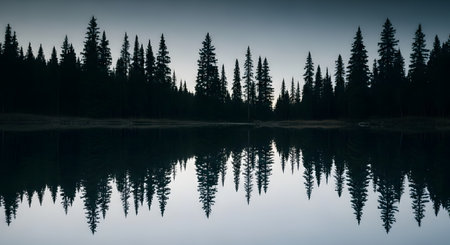 A minimalist, monochromatic landscape captures the silhouette of a dense pine forest line reflected perfectly in the surface of a calm lake or pond. The dark trees contrast sharply with the pale sky and the mirrored reflection, creating a tranquil and moody scene.
