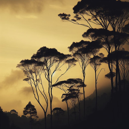 Majestic trees stand in silhouette on a hill as the sun sets behind mountains, casting a warm glow. Mist envelops the scenery, enhancing the tranquil atmosphere.