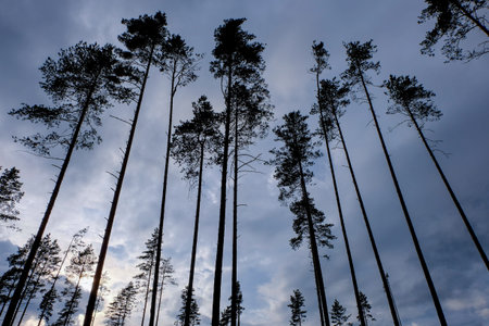 Dark silhouettes of high pines and spruces from below upwards on background of clear gloomy sky with copy space. Coniferous trees close up in faded blue tones. Eerie atmospheric monochrome landscape.