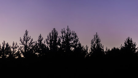 Dark Silhouettes of Pine Trees Against a Vibrant Twilight Sky, Nature Background, Scenic Landscape