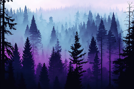 A foggy wood pine forest with dark trees shillouettes and purple blue colors. Dramatic fog in the forest illustration. Ai generated