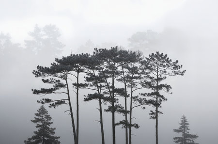 Imagine a serene landscape with towering pine trees rising from soft, enchanting fog, creating a scene that evokes deep appreciation for the beauty of nature, inviting peaceful contemplation
