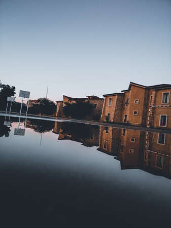 Sunset at the Alqueva reservoir, bank of the Malagón in Paymogo, Huelva, Andalusia, Spain. Beautiful sunset in warm colors with the sky reflected on the flat surface of the water.