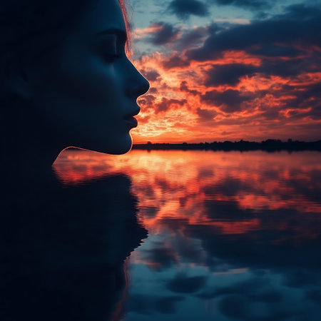 A single person stands silhouetted against a vibrant sunset, their reflection mirrored in a calm body of water. The clouds are ablaze with fiery hues, creating a captivating scene.