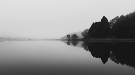 calm lake surrounded by fog, surface reflecting faint outlines of nearby trees landscape