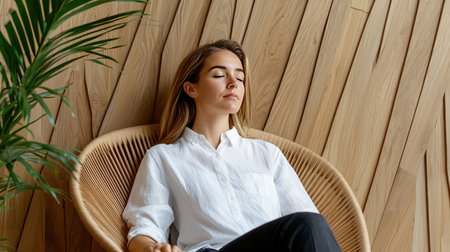 Serene young woman with blonde hair and closed eyes, wearing a textured white shirt and dark pants, sitting peacefully in a light brown woven chair.