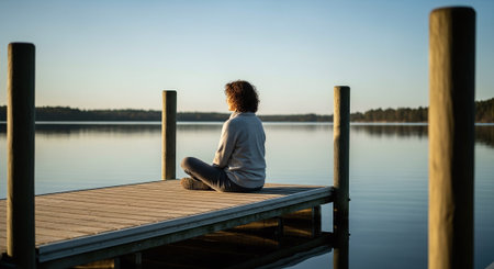 A serene woman relaxes on a wooden dock by the water, enjoying a moment of peace and tranquility in nature, with soft waves and sunlight enhancing the ambiance.
