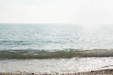 Silver sea glittering background. Minimalistic summer landscape in shades of gray and silver. Midday hot day. The bright sun is reflected in the waves. Natural horizontal background with copy space