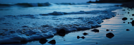 Tranquil evening waves on rocky shoreline at dusk. That the image is generated using AI.