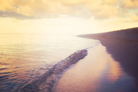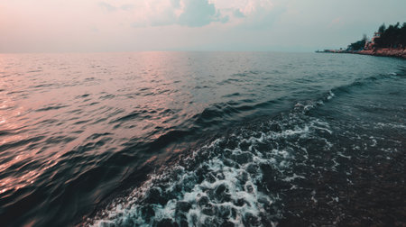 Gentle waves caress the sandy shore during sunset, creating a peaceful and serene coastal atmosphere. Perfect for relaxation, reflection, and nature lovers.