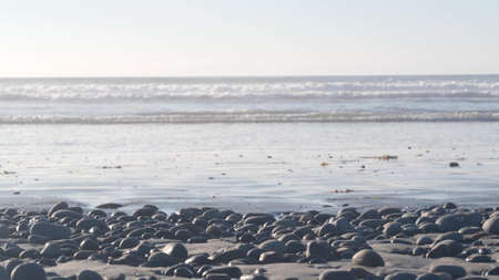 Pebble rocks on sandy beach by ocean sea water waves, round smooth stones or boulders low angle view in soft focus. California coast vacations aesthetic, USA. Seascape natural background with bokeh.