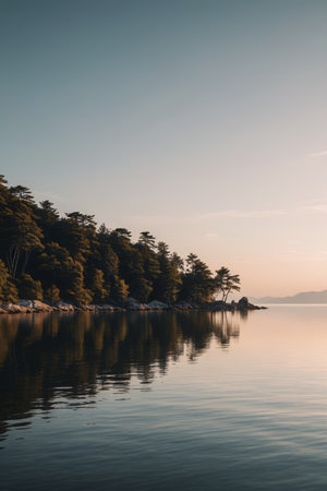 Serene lake at dawn with mist obscuring distant trees, clear sky reflected