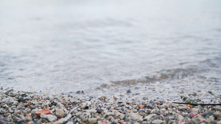 Pebble stones by the sea, diagonal water edge. Warm grey natural background with copy-space.