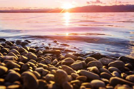 A high angle shot of the small rocks and pebbles by a lake captured at sunset