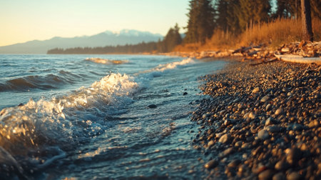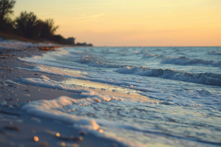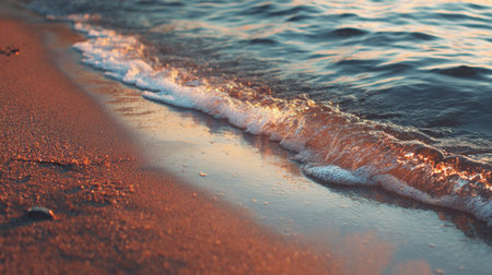 Beautiful ocean waves gently rolling onto a sandy shore, creating a serene coastal scene perfect for relaxation and tranquility during golden hour.