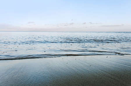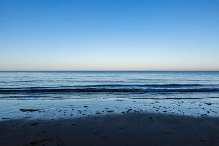 the wave in the beach before sunrise and the vanilla clearly sky, the landscape photo of the beautiful lonely beach on the dawn with no people and cloud.