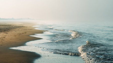 Experience a serene moment at a beautiful beach where gentle waves kiss the sandy shore, enveloped in morning mist and soft light, inspiring tranquility and calm.