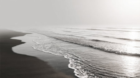 This tranquil coastal scene features gentle waves lapping at the shore under a blanket of soft morning fog, creating a serene and calming atmosphere in grayscale.