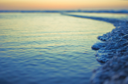 Sea wave crashing sand on sunset evening beach. Dusk ocean tide splashing coastline outdoors. Close up white foam water surface storming on beautiful romantic sunrise shore. Scenic nature concept.