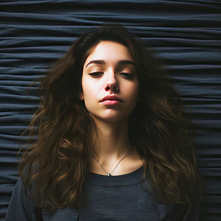Serene Young Woman with Closed Eyes in Peaceful Pose Against Dark Background.