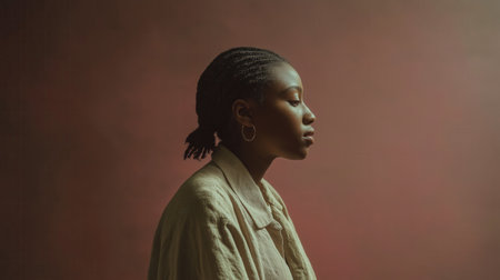Fashion portrait of an African woman wearing hoop earrings, against a textured pink backdrop.