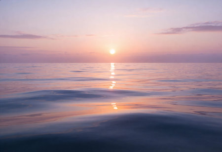 Peaceful seascape with a soft pastel sunset over calm ocean waters, creating a tranquil and dreamy atmosphere.1